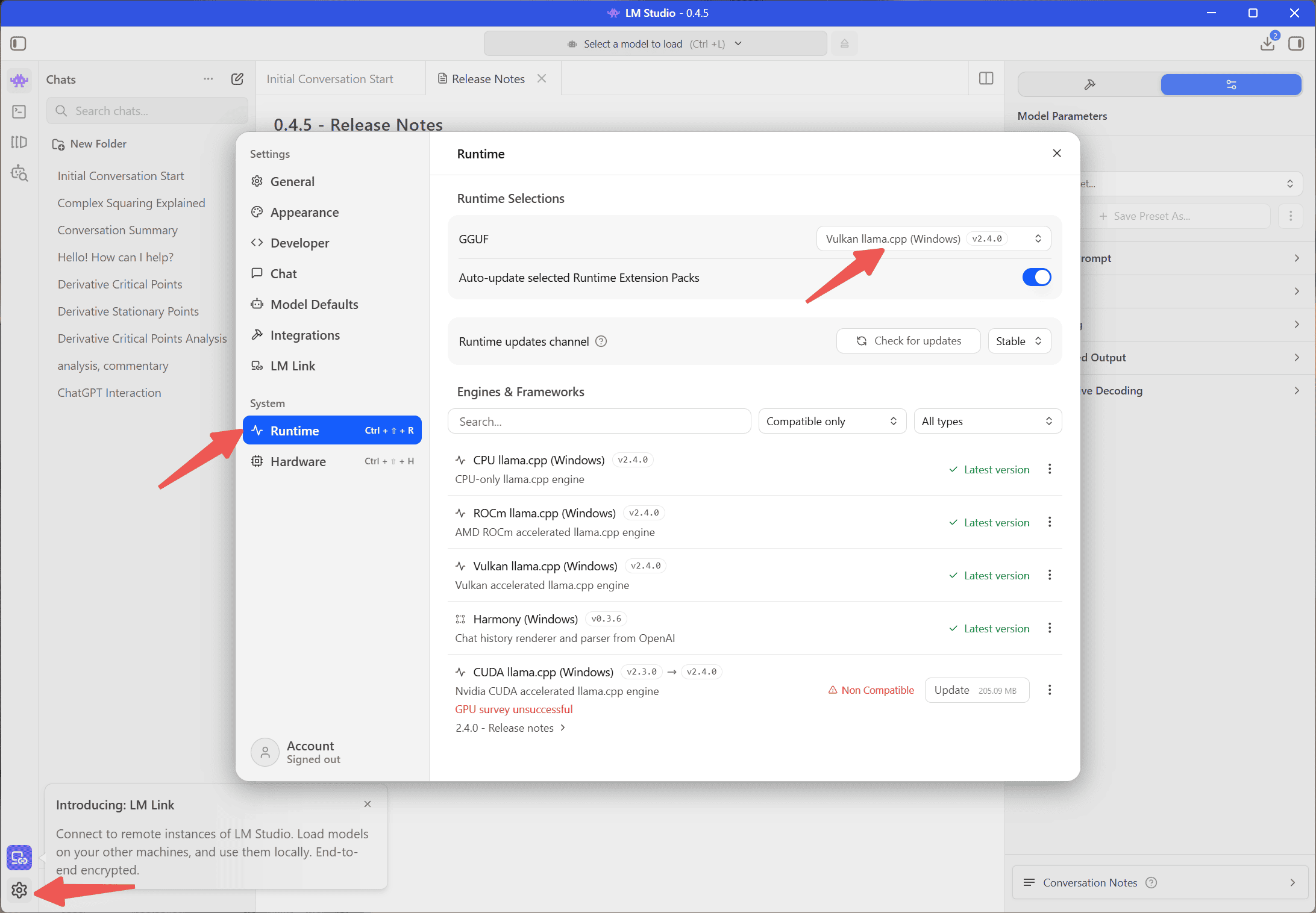 インストール完了後、設定画面でシステム→ランタイムを選択します。これらのオプションはLM Studioが大規模モデルを実行するための「計算エンジン」です。GGUFはVulkan llamaを選択してください。下部に更新情報が表示された場合は、最新版にアップグレードしてください。