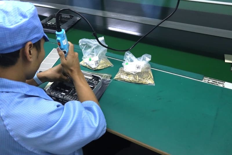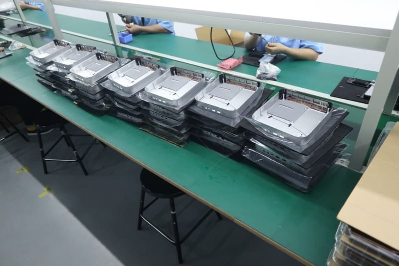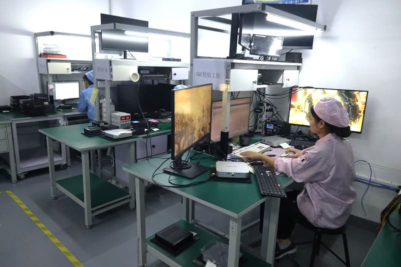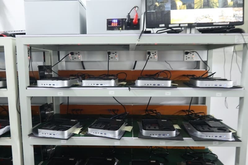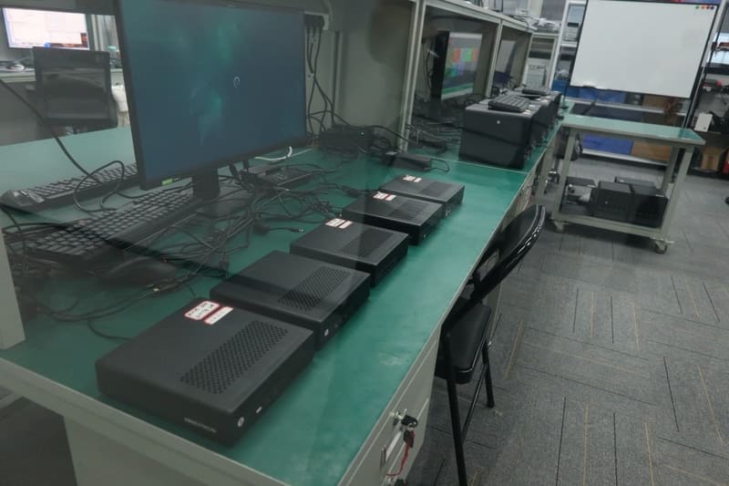 今回訪れた時はちょうどヨーロッパ向けの「AI X1 Pro」の組み立て中であったのだが、組み立てからパッケージングまで十数工程、1工程あたり1分で作業が進められていた。ただ、組み立て自体は比較的早く終わるものの、エージングテストで2時間~3時間費やされるので、実製造時間は4時間程度かかるとのことだ。自動化の部分は今のところエージングテストのみとなっているが、担当によれば同じミニPC業界内でも有数とのことだ。なお、製造ラインは全部で5つあるが、本社に統合されているのは1つのみで、残り4つはほかの場所にあるという。