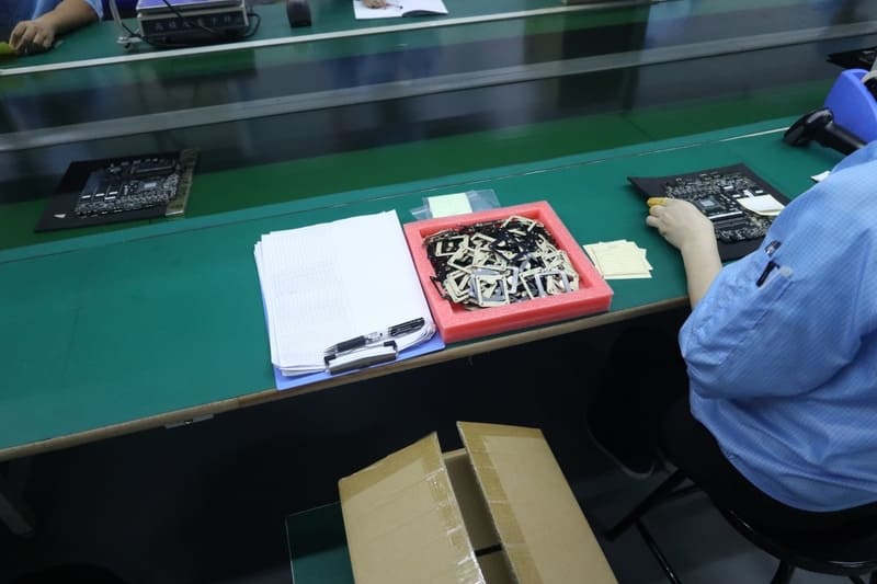 こちらはメインの製造ライン。まずはマザーボードを開梱し、いくつかパーツを取り付ける