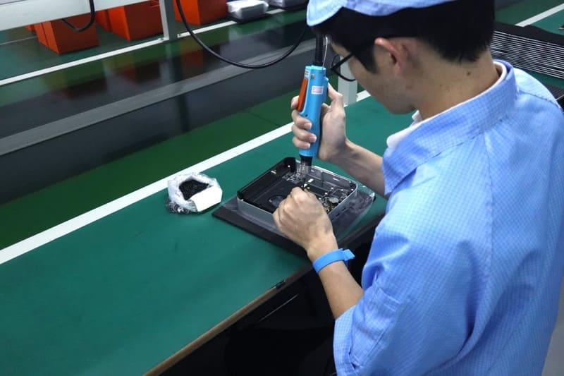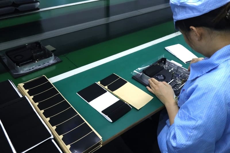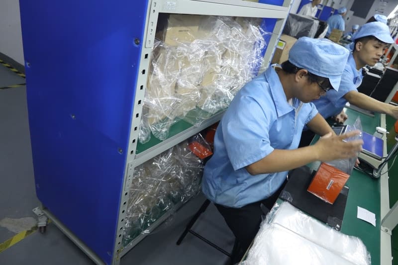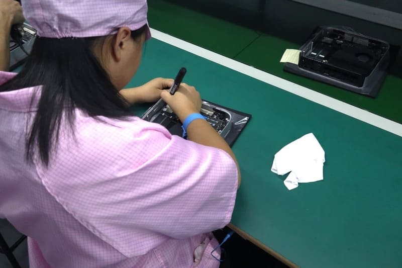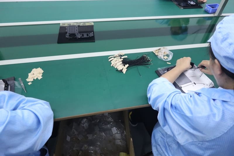 メインの製造ラインとは別室で、外装にWi-Fiアンテナを貼り付けるといった事前の作業が行なわれている