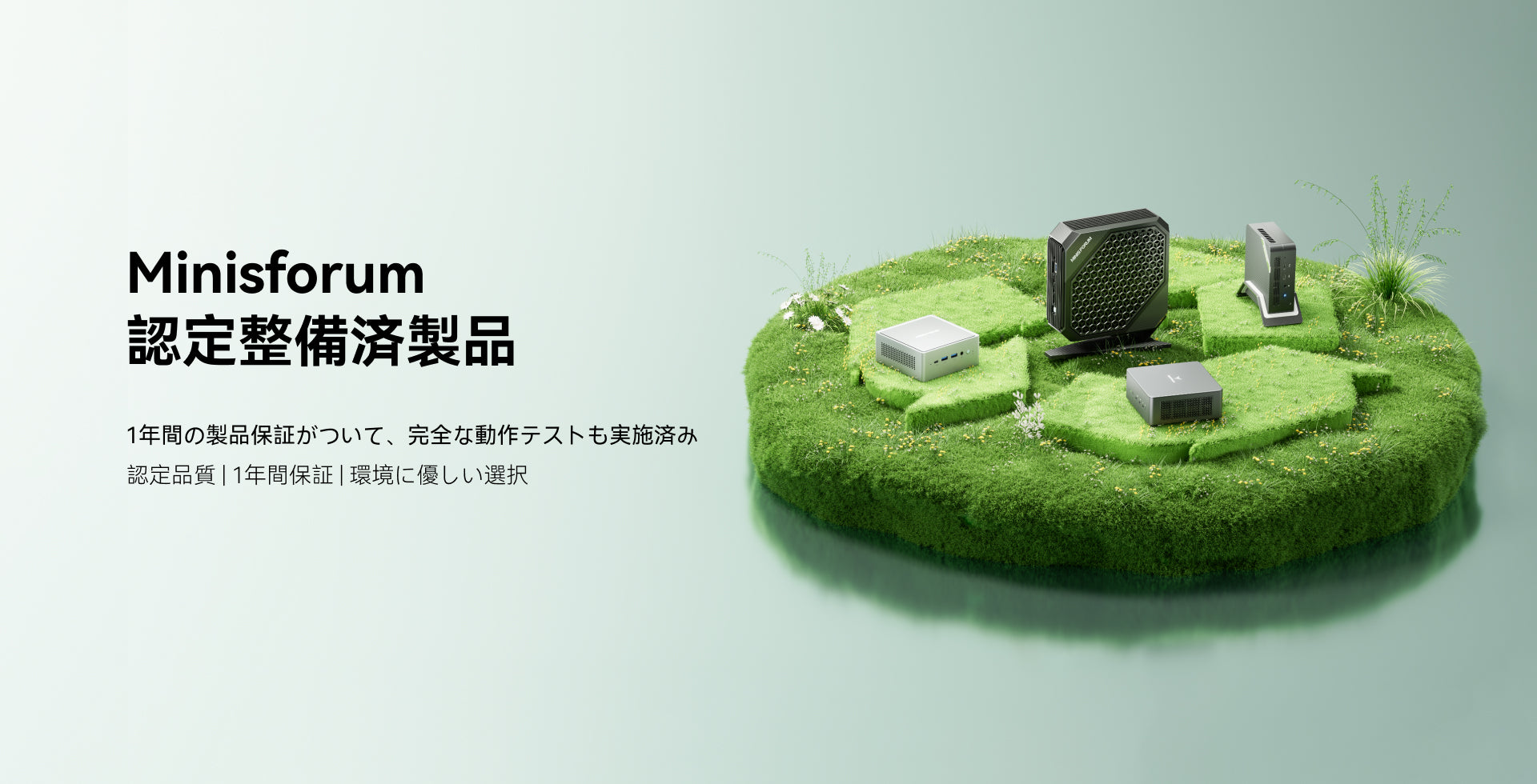 本ページに掲載しているMINISFORUM整備済み品・再生品は、お客様は使用後、様々な理由で当社に戻ってきた製品を当社監修の下、厳格な出荷基準を満たす再生を行った商品です。外観につきましては、汚れやキズが残存する場合がございます。
