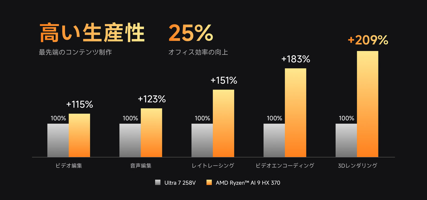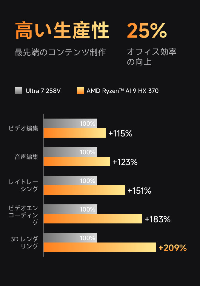 最先端のAMD Ryzen™ AI 9 HX 370プロセッサーを採用し、性能とエネルギー効率の優れたバランスを実現。ゲームやクリエイティブアプリケーションをスムーズに動作させます。内蔵のAI機能により、次世代AI技術を体験し、マルチタスク処理の高速化、生産性の大幅向上、チームコラボレーションの強化を実現します。