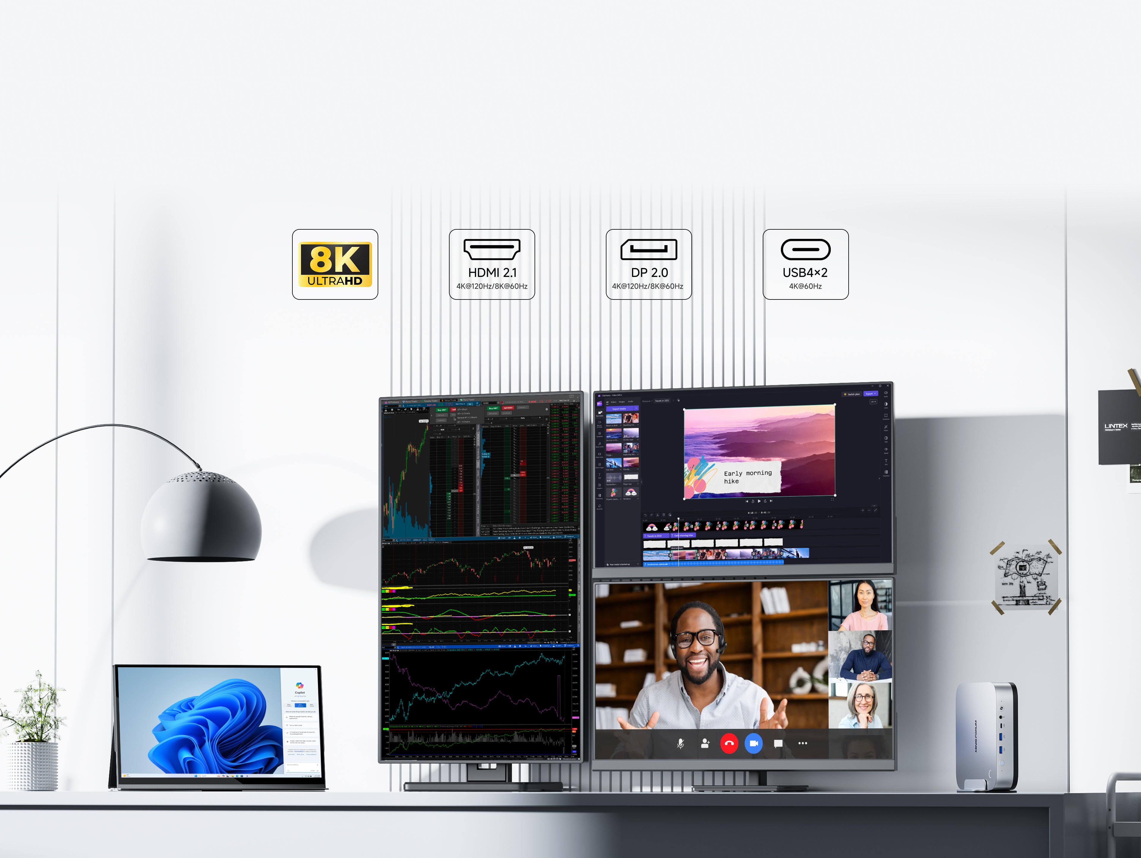 - HDMI 2.1 FRL|2×USB4|DP 2.0|ケンジントンロック