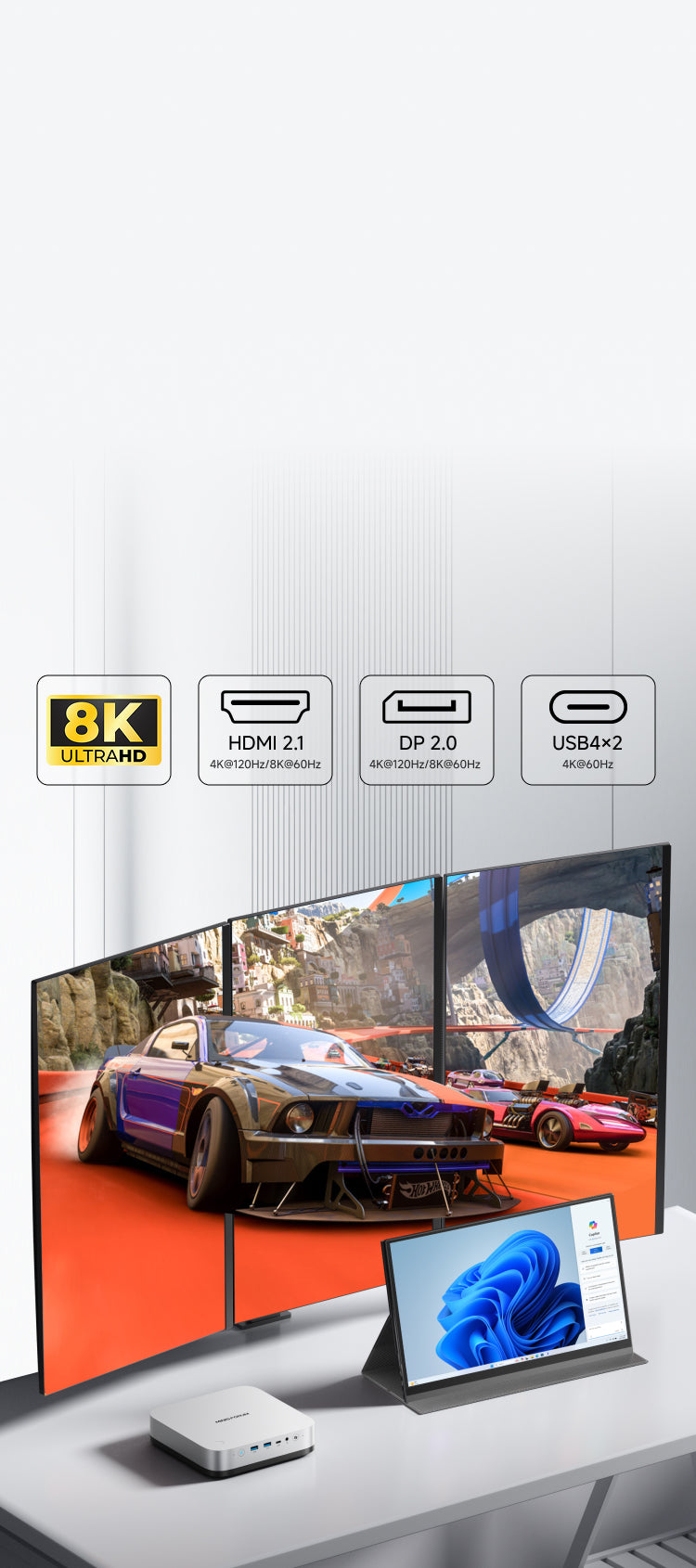 電源アダプター接続に伴う安定性の問題やノイズを低減。電源ケーブル1本だけで給電可能、デスク環境を綺麗に保てます。外出時には電源ケーブルとMINI PCのみを持ち運べば良いので、携帯や移動がより簡単になります。