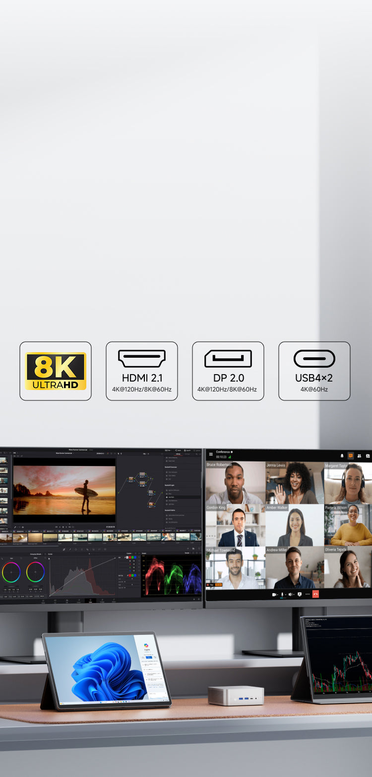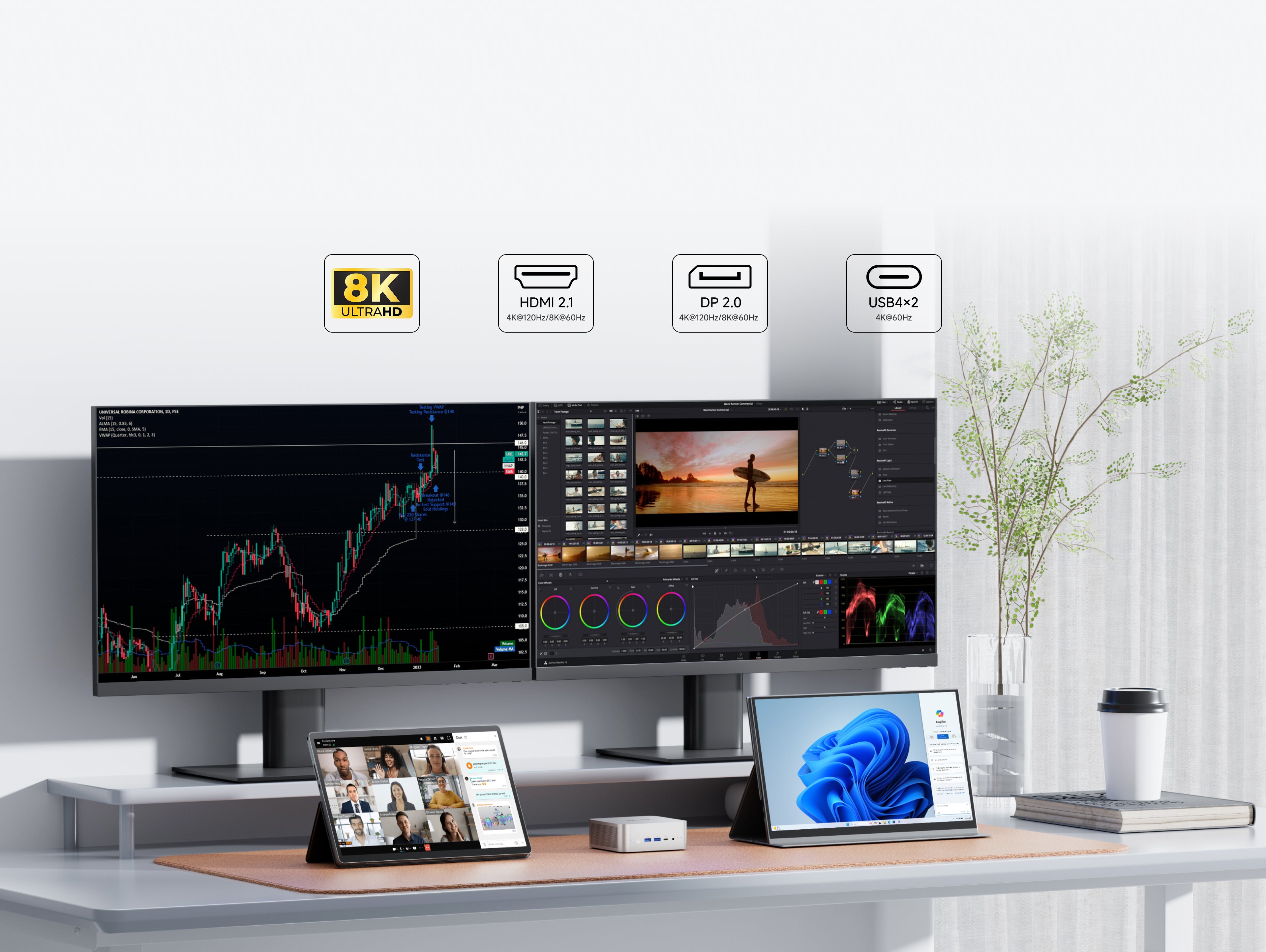 最大40Gbpsのデータ転送速度を実現。大量のデータを極めて短時間で転送でき、大容量ファイルの頻繁な転送が必要なユーザーにとって、作業効率を大幅に向上させます。USB4を介して高性能グラフィックカードを接続することで、グラフィック処理能力を著しく向上させ、より高い解像度の出力やマルチディスプレイ表示をサポートします。