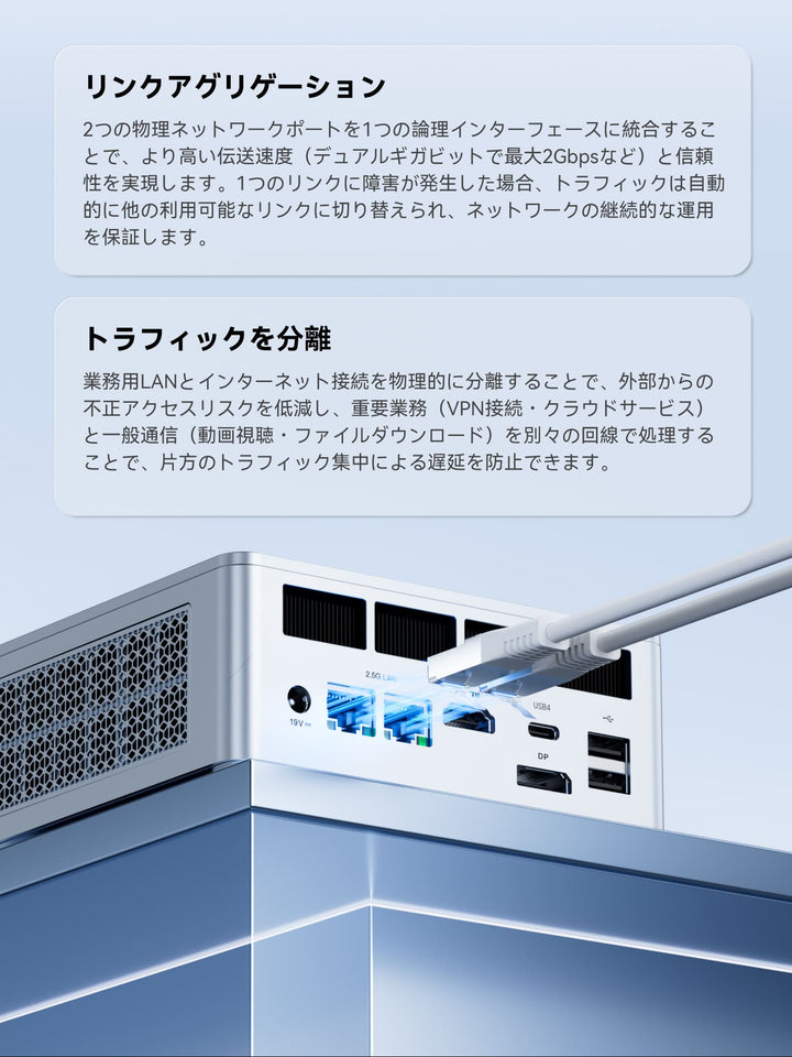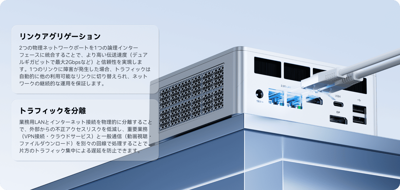 デュアル2.5GbEポートにより、M1 Plusは高性能ソフトウェアルーターソリューションへと進化します。現代的なワークプレイス及びその他多様なビジネスシーンにおいて、高速かつ安定したネットワーク接続性を実現します。