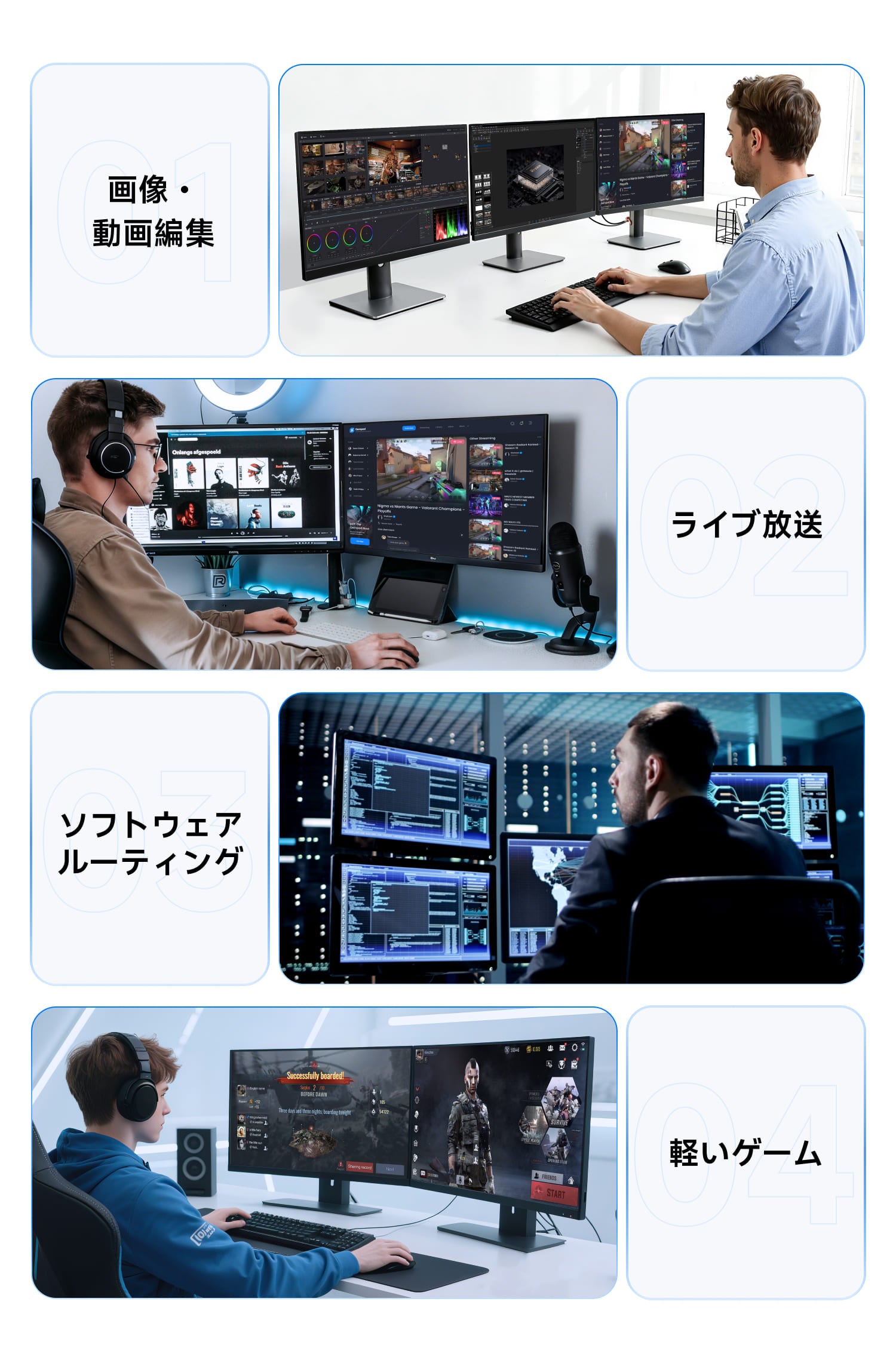 3台の独立した4Kディスプレイを操作し、生産性を飛躍的に向上させます。