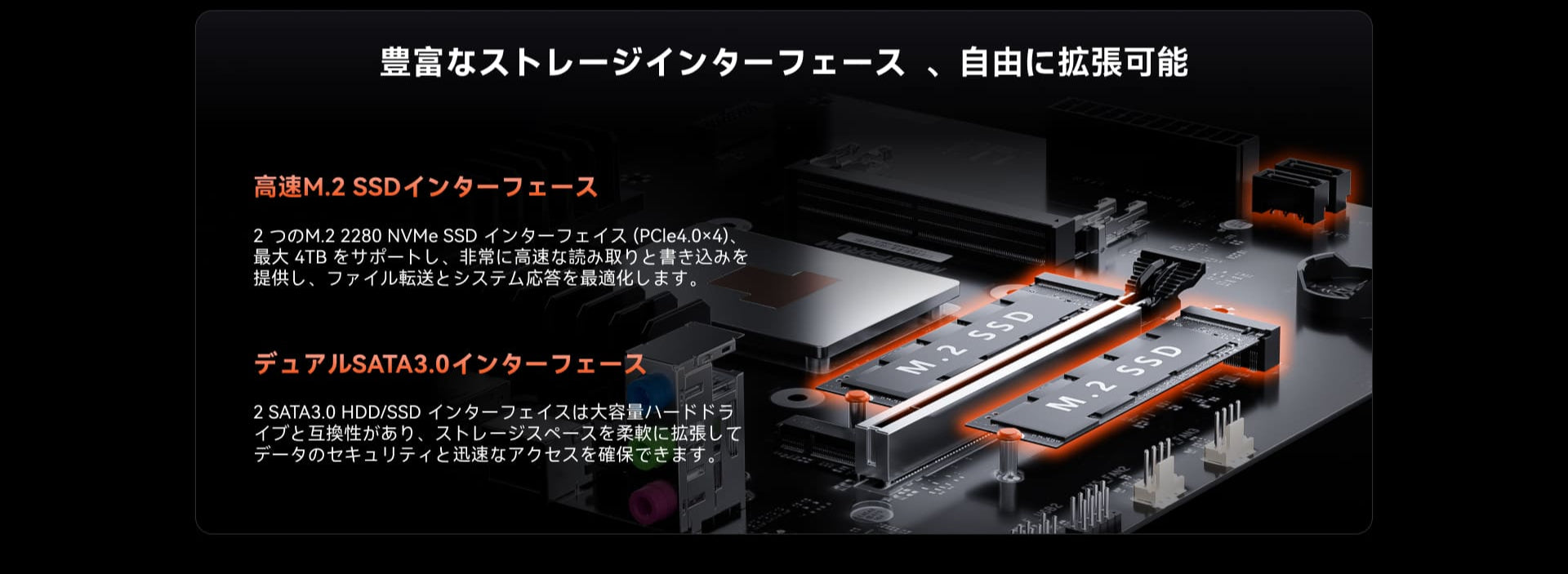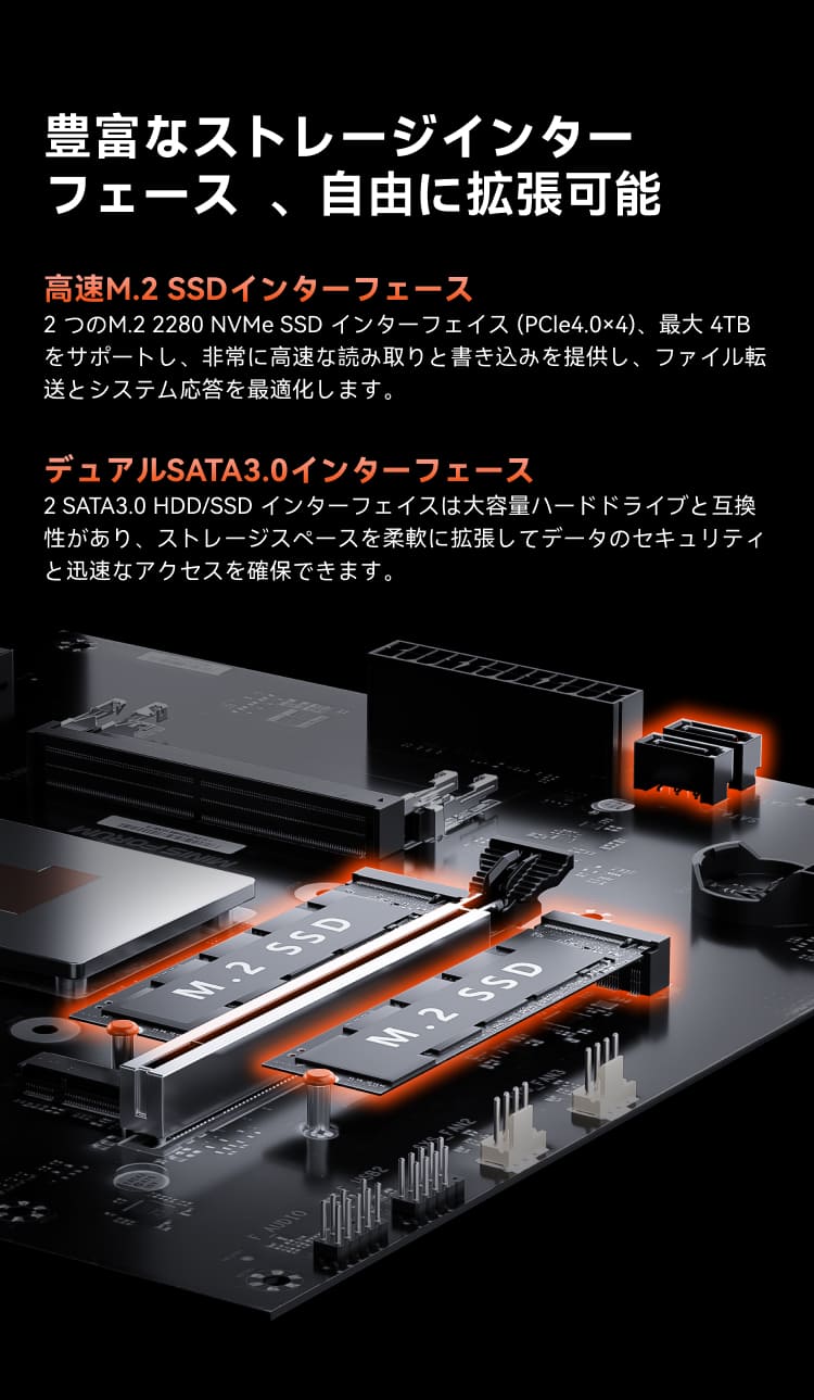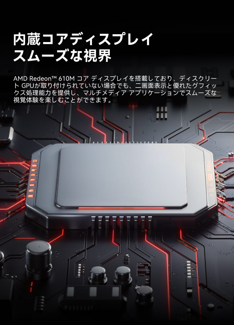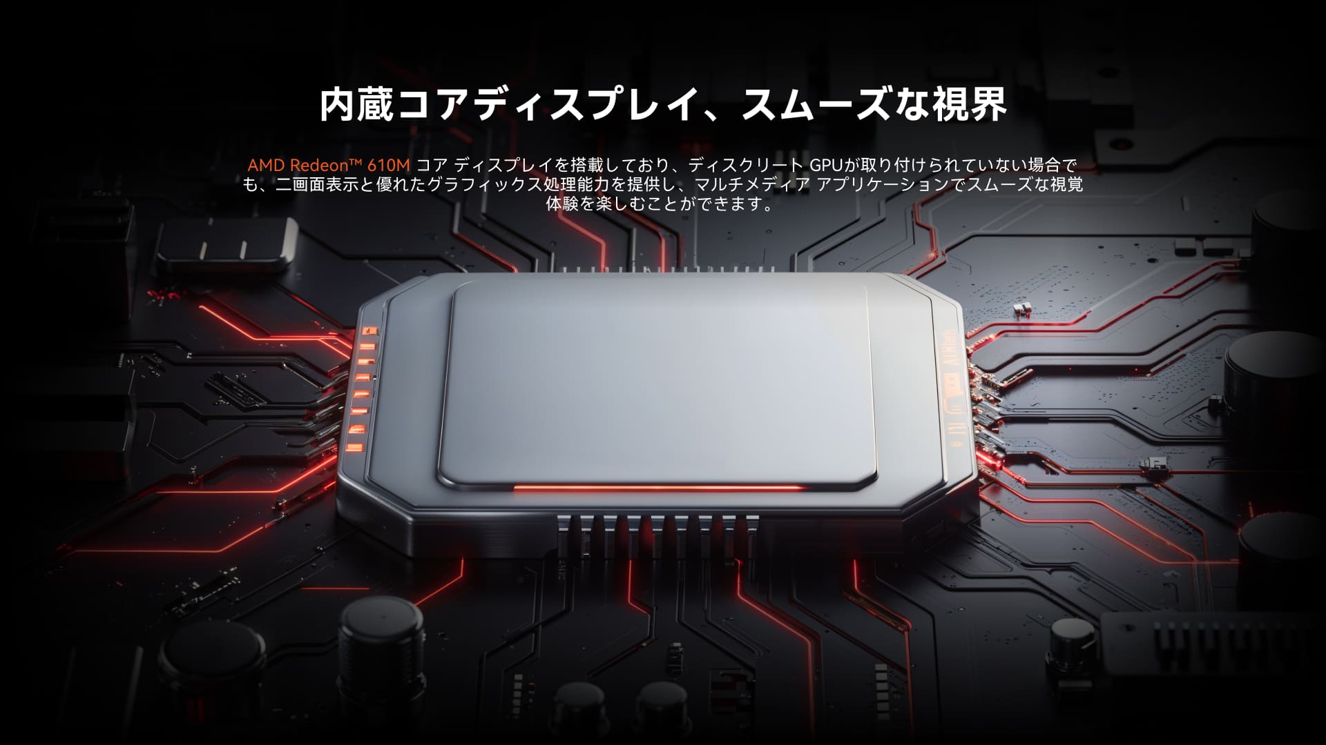 DDR5 Dual channel (SODIMM Slots×2, up to 5200 MT/s, 最大 96GBまで)
