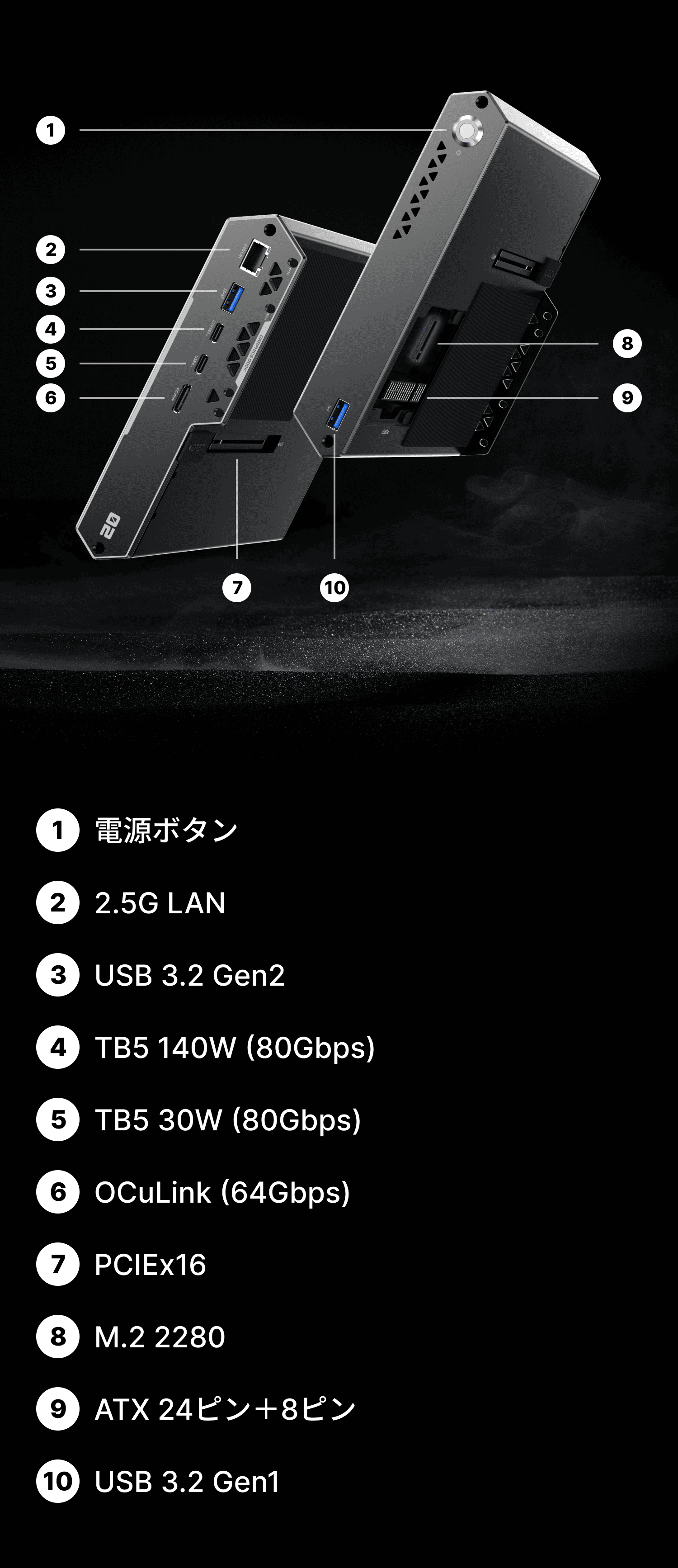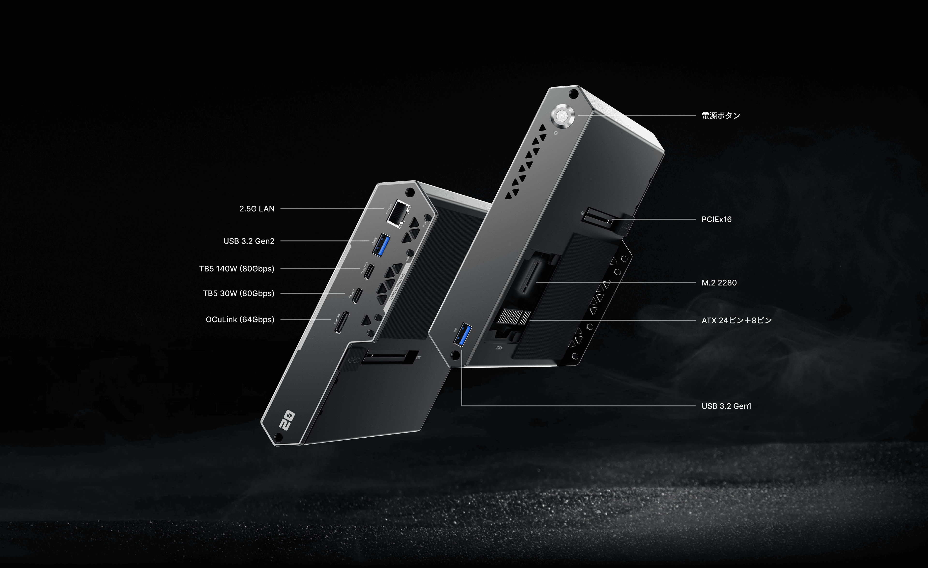 豊富な拡張性で作業環境を一元化:DEG2 背面には必要な端子を集約します。2.5G LAN で高速ダウンロードと NAS アクセス、USB 3.2 Gen2 で高速ストレージやキャプチャ機器に対応します。2 基の Thunderbolt 5 ポート は最大 80Gbps 帯域に加え、最大 140W / 30W 給電 に対応し、ノート PC を 1 本のケーブルでドッキングできます。さらに 64Gbps OCuLink ポート によりGPU へ直接 PCIe 経路が確保され、最大性能が必要な AI・レンダリング・ゲーム処理で真価を発揮します。ケーブルは最小限、帯域は最大限——ゲーム・AI・制作に備えた接続性です。