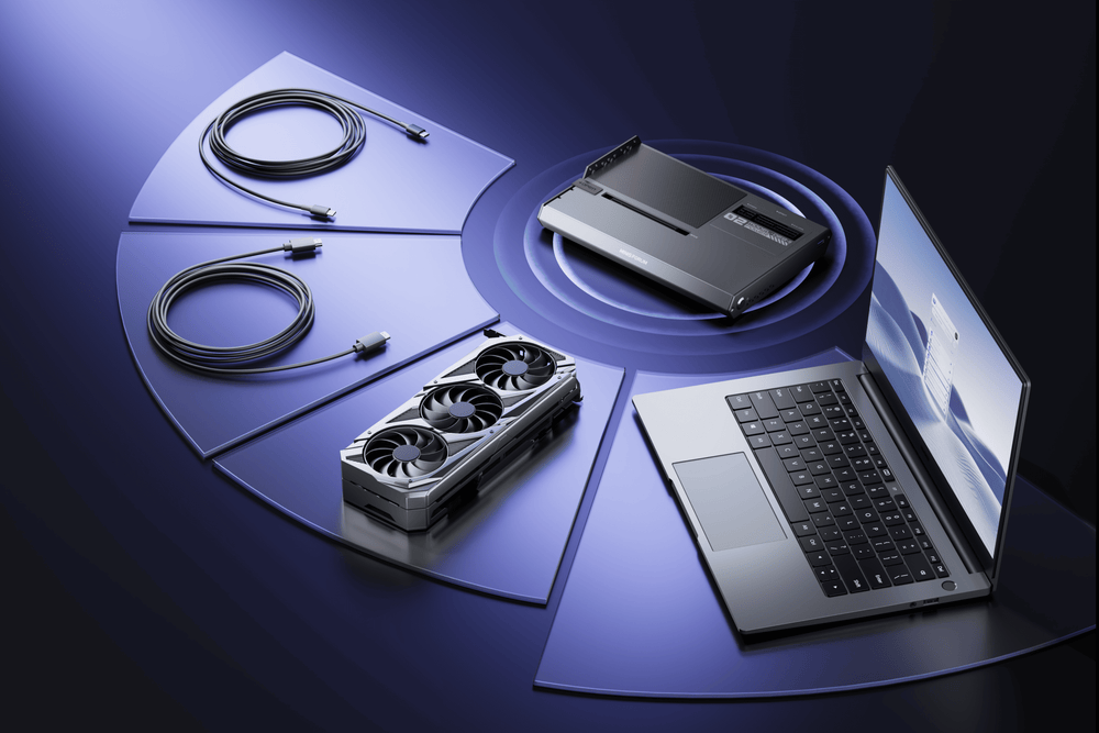 AIとクリエイティブワークフローに最適化されたDEG2は、モデル、アセット、プロジェクトファイルを内蔵M.2 2280に集約して保存できるため、GPUベースと作業環境を一体化できます。ホストを切り替えても作業環境をそのまま引き継げます。高負荷のGPU処理はDEG2内部のデスクトップGPUが担い、 ノートパソコンは操作と表示のみを担当することで、高い機動性を保ちながら、ワークステーションクラスに近い計算性能を活用できます。レンダリング、編集、AI生成といった処理はすべてこの単一GPUベース上で完結するため、 デバイス間での煩雑なファイル転送を削減し、ワークフロー全体を一箇所に集約できます。