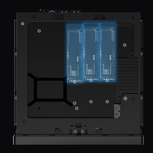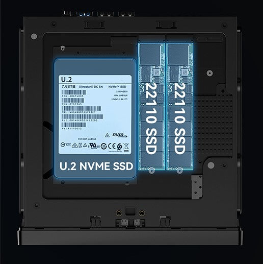 またエンタープライズクラスのストレージをサポートし、 1つの U.2 NVME SSDと2つの22110 M.2 NVME SSDの構成で、合計最大24TBまで増設可能です。大容量のストレージを必要とするプロのニーズに応えます。