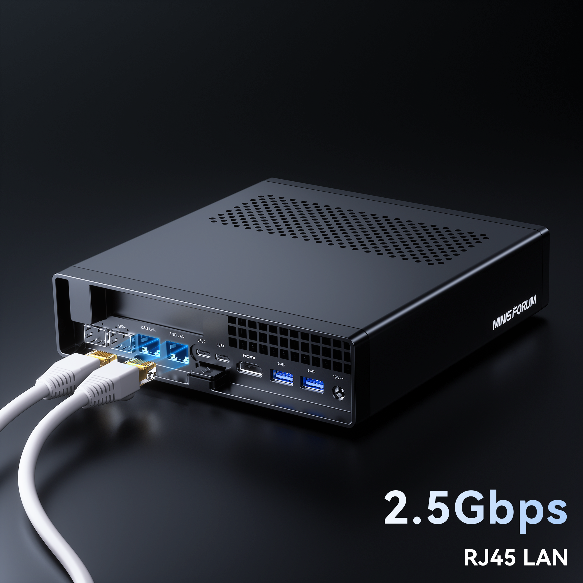 10Gbps SFP+ LANポート二つ、2.5Gbps RJ45 LANポート二つ、USB4ポート二つ合計最大65Gbpsのイーサネットを構築することができ、前例のない高速ネットワーク体験を楽しむことができます。