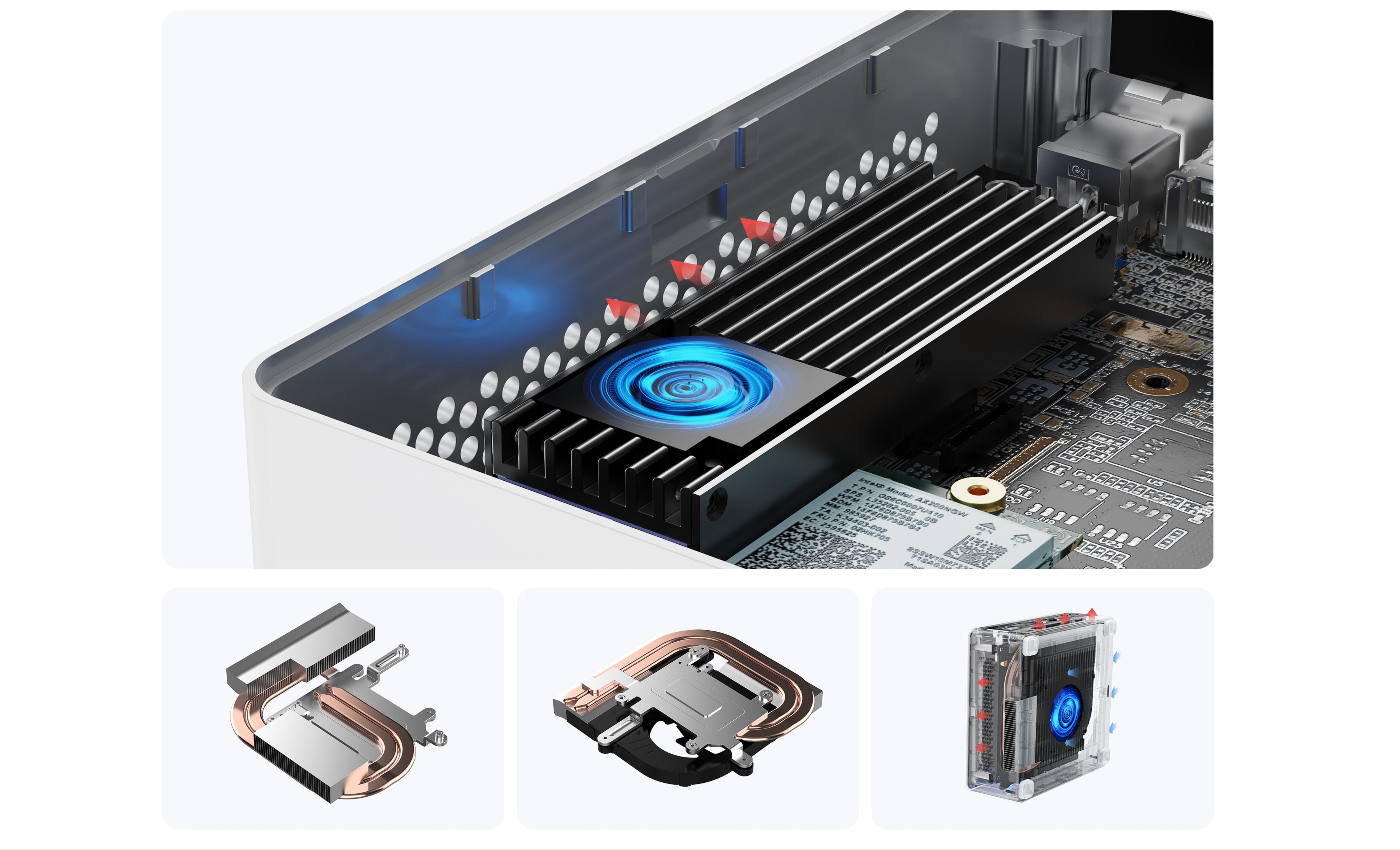 ケースに2つの通気孔を採用し、流れるようなエアフローを実現、放熱性能を向上させるため、銅製ヒートパイプ2本を採用し、冷却効率を高めています。新型SSDヒートシンクと側面冷却口により、メモリやSSDの放熱性を高める。