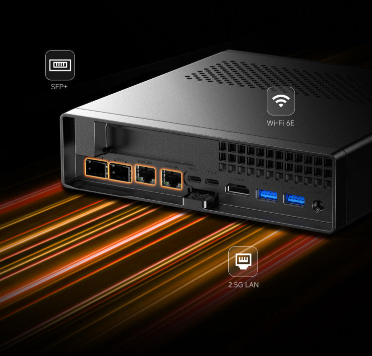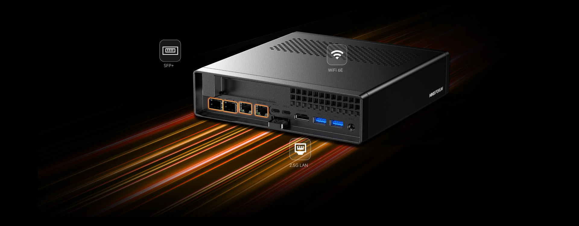 - 10Gbps SFP+ LAN ×2|2.5Gbps RJ45 LAN ×2|WIFI 6E & BT 5.3