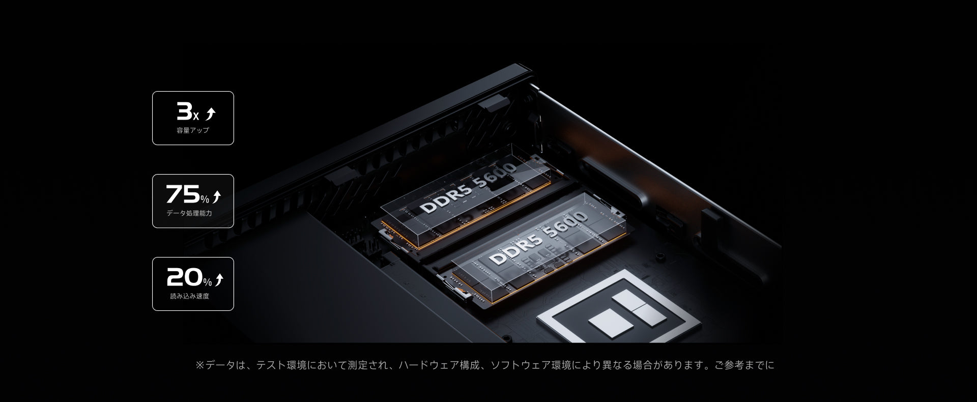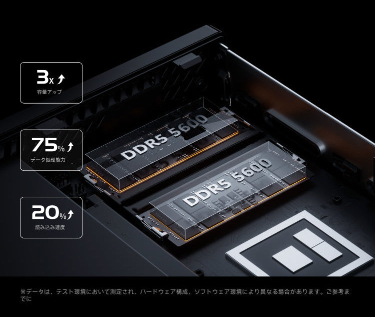 DDR5-5200Mhz デュアルチャネル(SODIMMスロット×2、最大96GBまで)