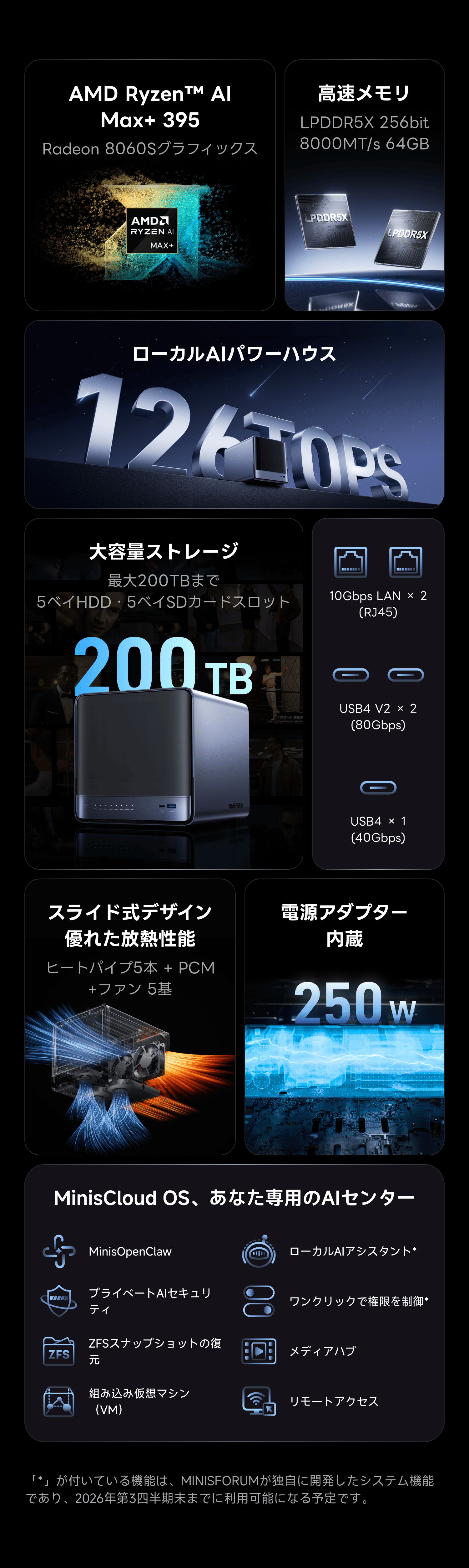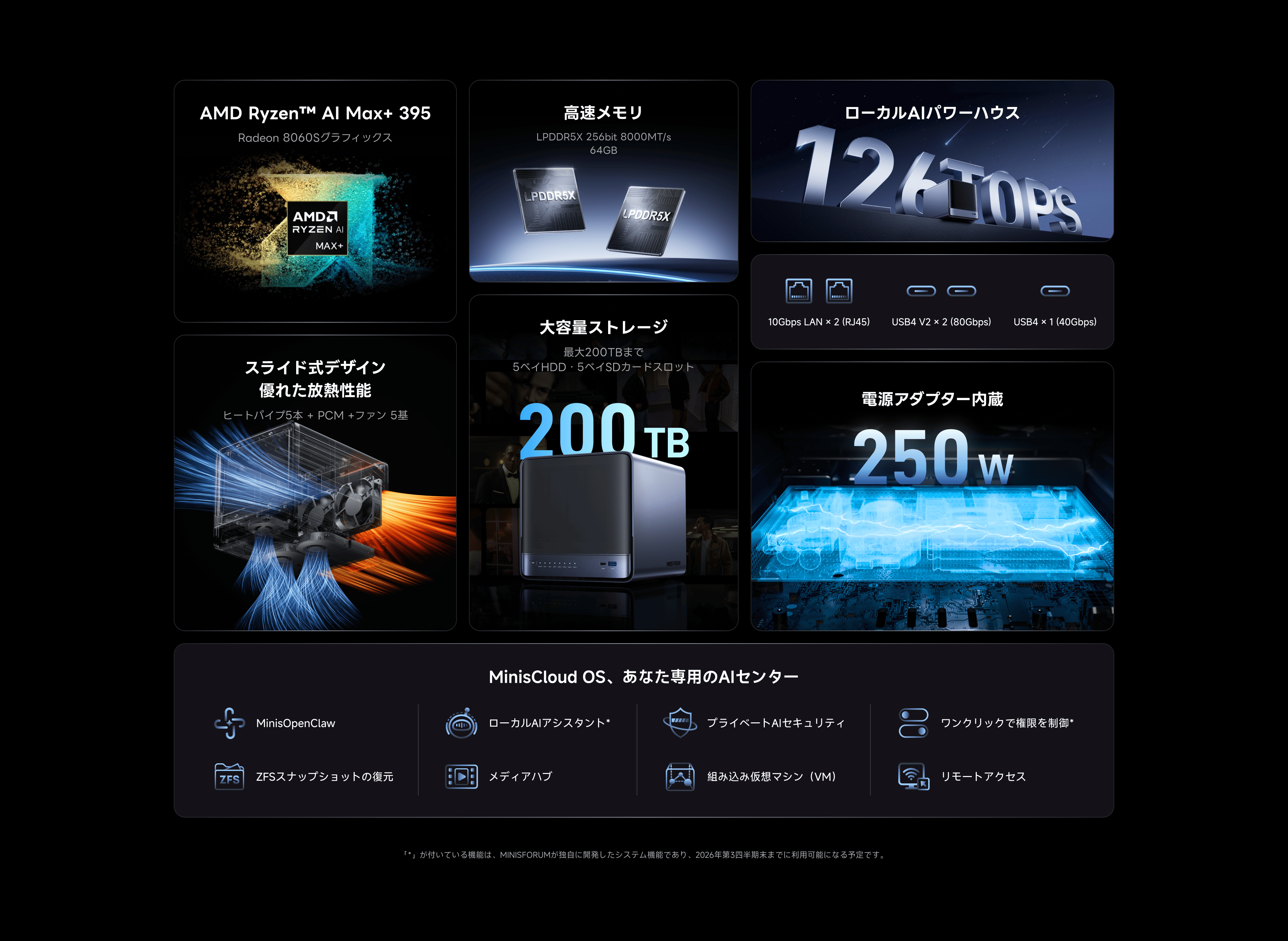 「*」が付いている機能は、MINISFORUMが独自に開発したシステム機能であり、現時点では一部の機能のみがサポートされています。全機能は2026年第3四半期末までに利用可能になる予定です。