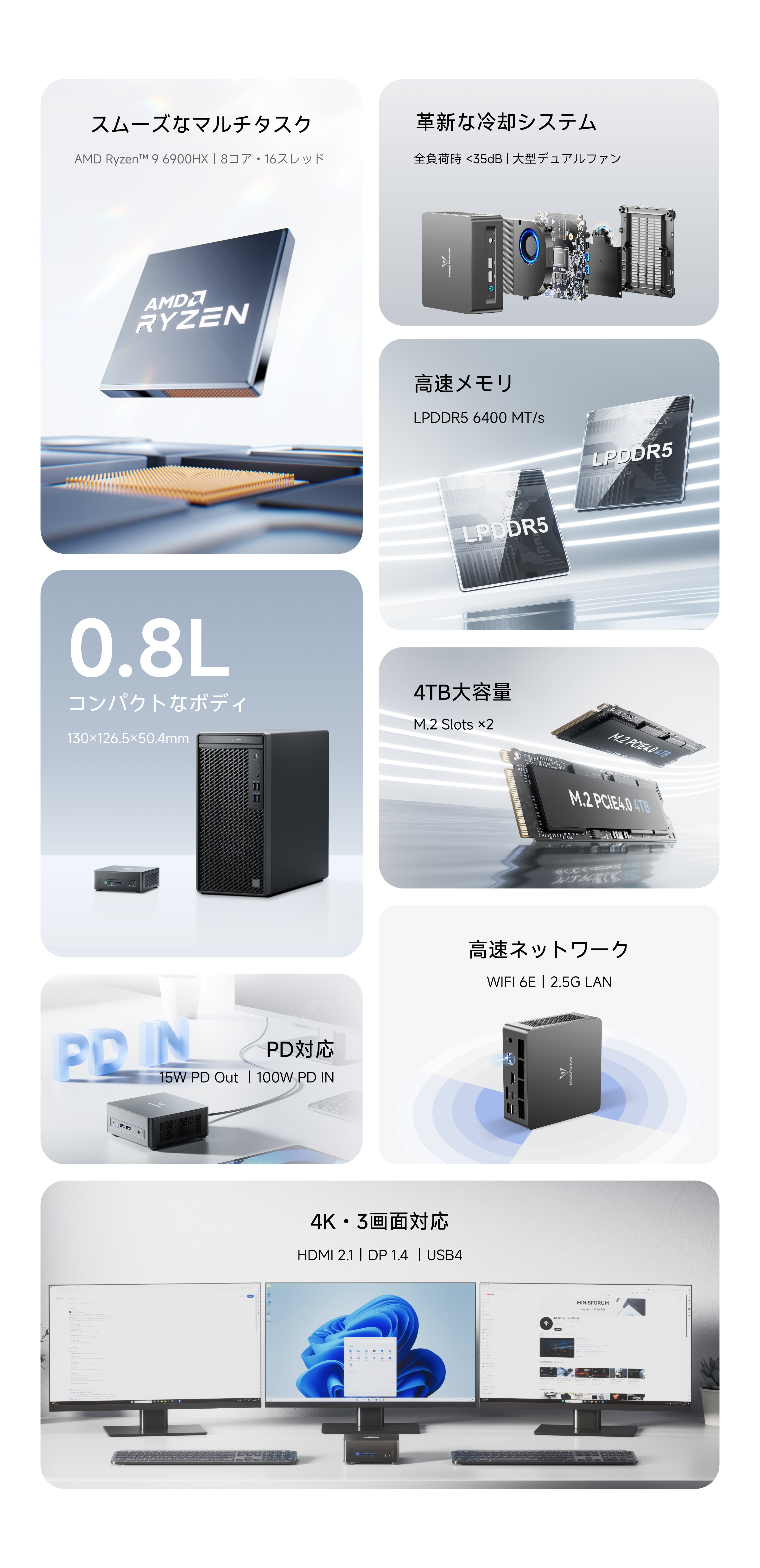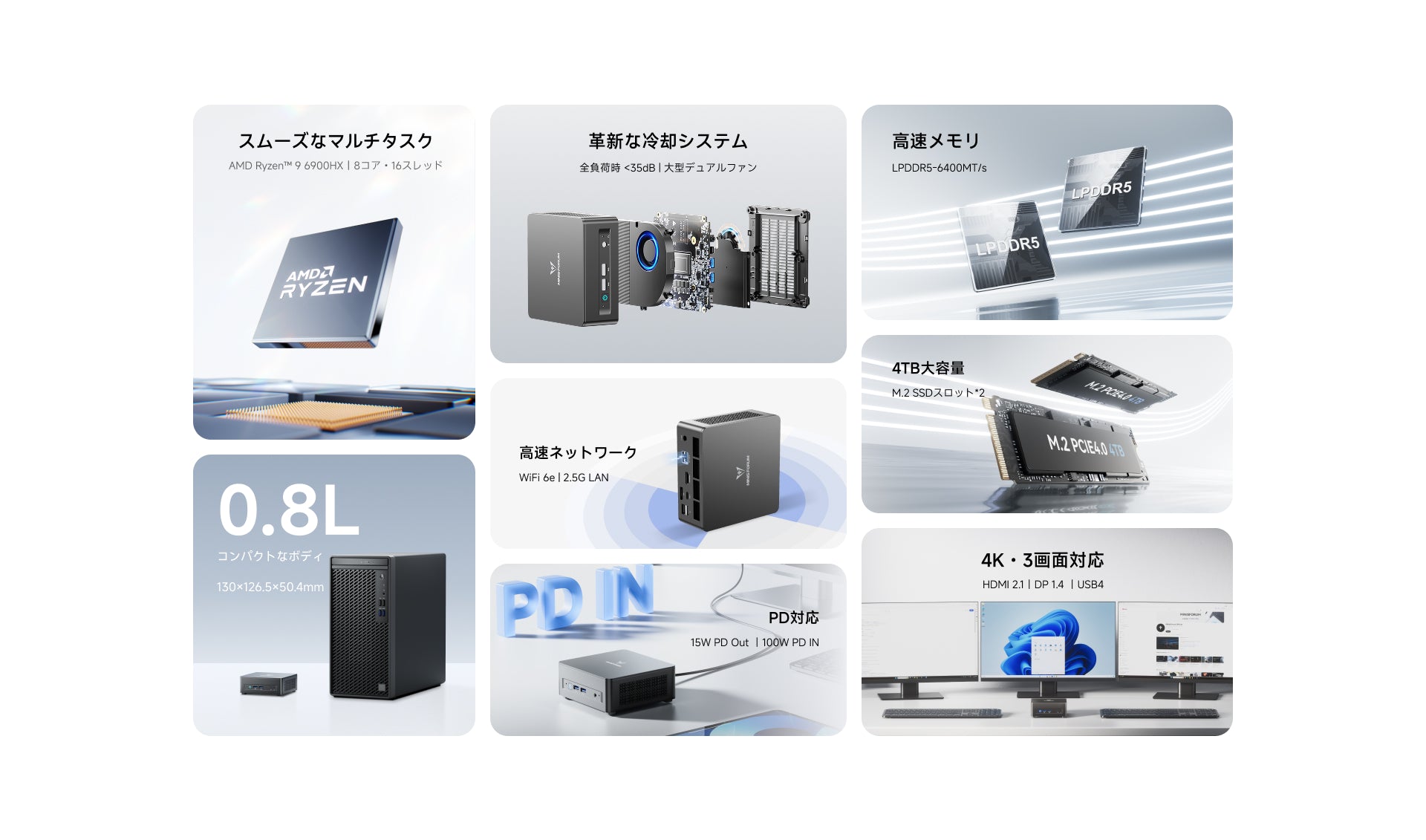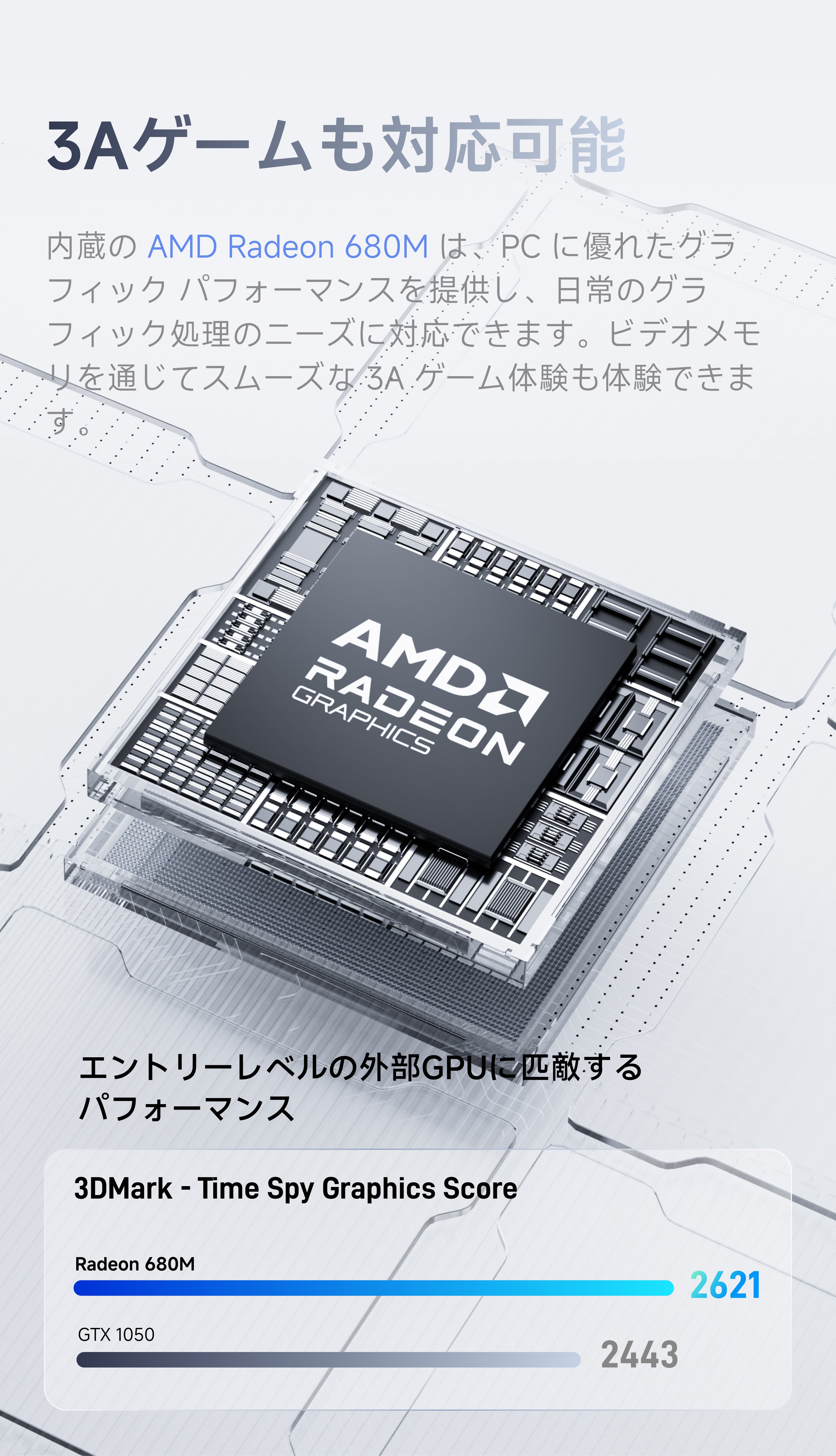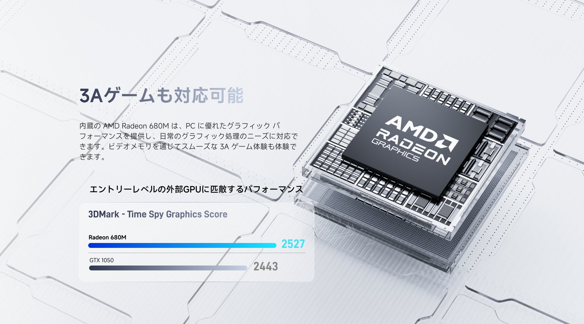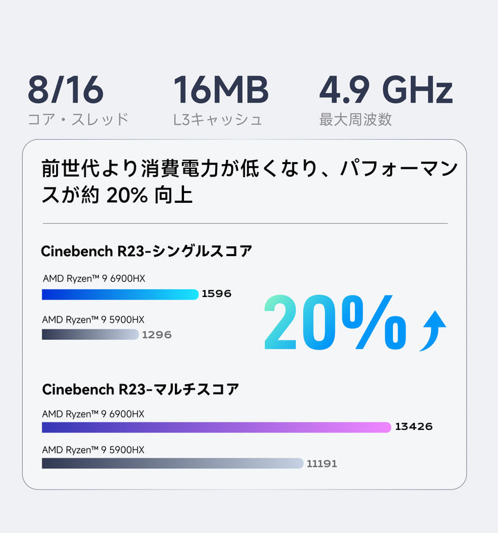 AMD Ryzen™9 6900HXプロセッサーは、8コア/16スレッドを備え、65W TDPにより卓越した効率性を実現します。スムーズなマルチタスク処理とシステムパフォーマンスを向上し、高度な計算能力を提供します。